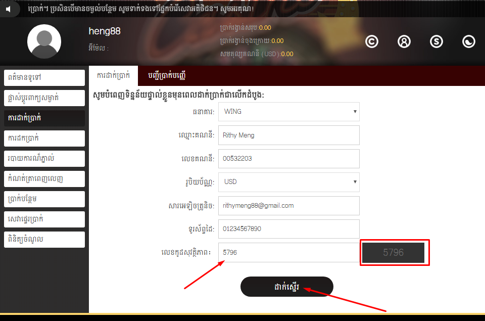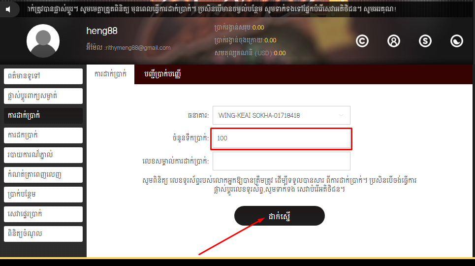 - សូមបំពេញចំនួនទឹកប្រាក់ ដែលអ្នកចង់ធ្វើការចូលលេងជាមួយនឹងវេបសាយយើងខ្ញុំ រួចដាក់ស្នើគឺ ជាការស្រេច។