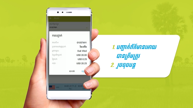 ចូរពិនិត្យរាល់ព័ត៌មានវេរលុយរបស់អ្នកអោយបានត្រឹមត្រូវ រួចចុចពាក្យថា “បន្ត” ។